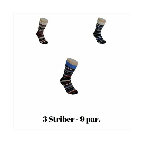 Vi er selv vilde med denne sampak, de 3 striber. Du får ialt 9 par super flotte stribede strømpe.