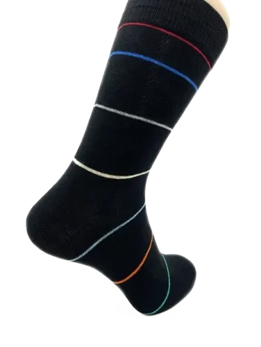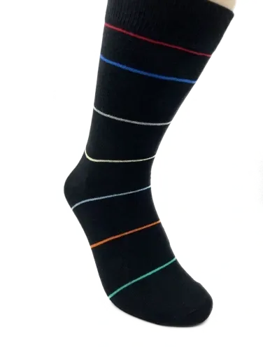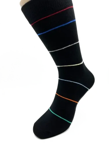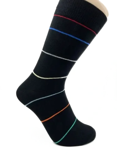 Disse strømper er designet med en grundfarve i sort, der er smukt kontrasteret med tynde striber i grøn, orange, blå, rød og gul.