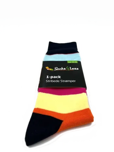 Med en kombination af blå, orange, rød, grøn, sort, gul og flere farver, er Stribe Fryd strømperne det perfekte valg for dem, der ønsker at tilføje et sprudlende og muntert element til deres outfit.