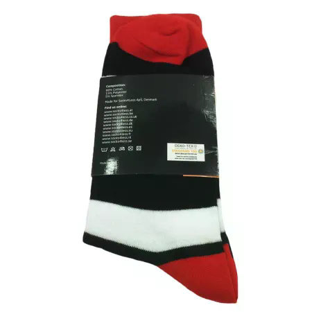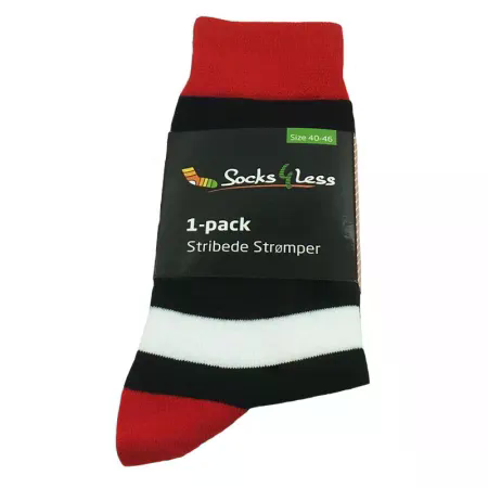 Pift dit outfit op med disse flotte, stribede strømper i rød, hvid og sort. Den brede stribe i forskellige farver skaber et unikt og stilfuldt look. Sokkerne er i størrelse 40-46 og passer til de fleste mænd.
