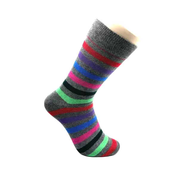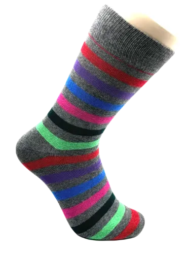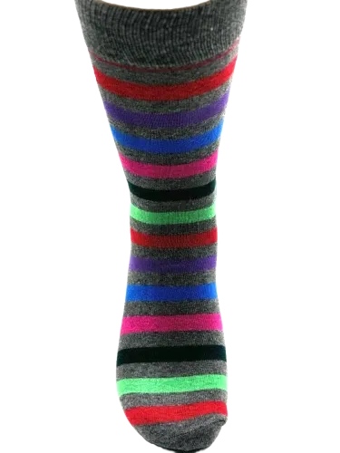 Tidløs Strib strømperne er perfekte til både formelle og afslappede lejligheder. De farvede striber tilføjer et strejf af personlighed og flair, mens den mørke grå grundfarve gør dem nemme at matche med forskellige outfits. Uanset om du skal på arbejde, til en fest eller bare slappe af derhjemme, vil disse strømper give dig den rette balance mellem stil og komfort.